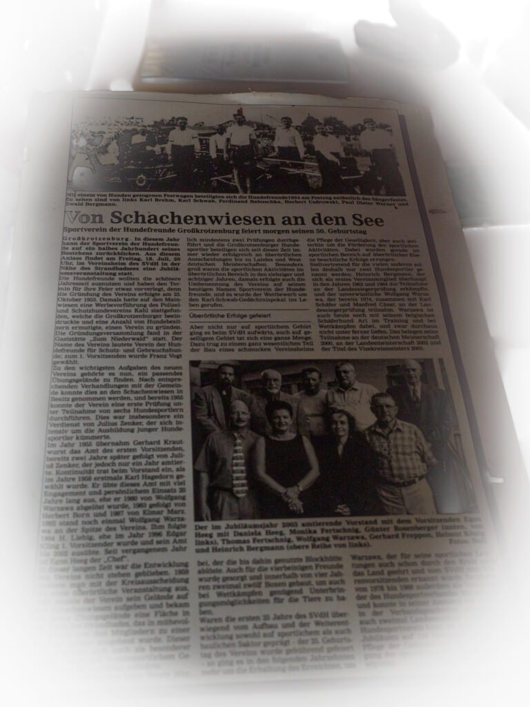 Im September 2023 wurde der Sportverein der Hundefreunde Großkrotzenburg 70 Jahre alt. Ein solches Jubiläum sollte Anlass genug sein, auch einfach mal auf den Weg, den so viele Menschen, über Generationen hinweg zusammen zurückgelegt haben, zurückzuschauen. Da gab es natürlich jede Menge Momente, die in unseren Köpfen hängen geblieben sind. Momente, an die wir uns noch lange, vielleicht auch ein Leben lang erinnern werden. Und das ganze Vereinsleben, das Schicksal des Vereins besteht schließlich aus der Summe dieser Momente.