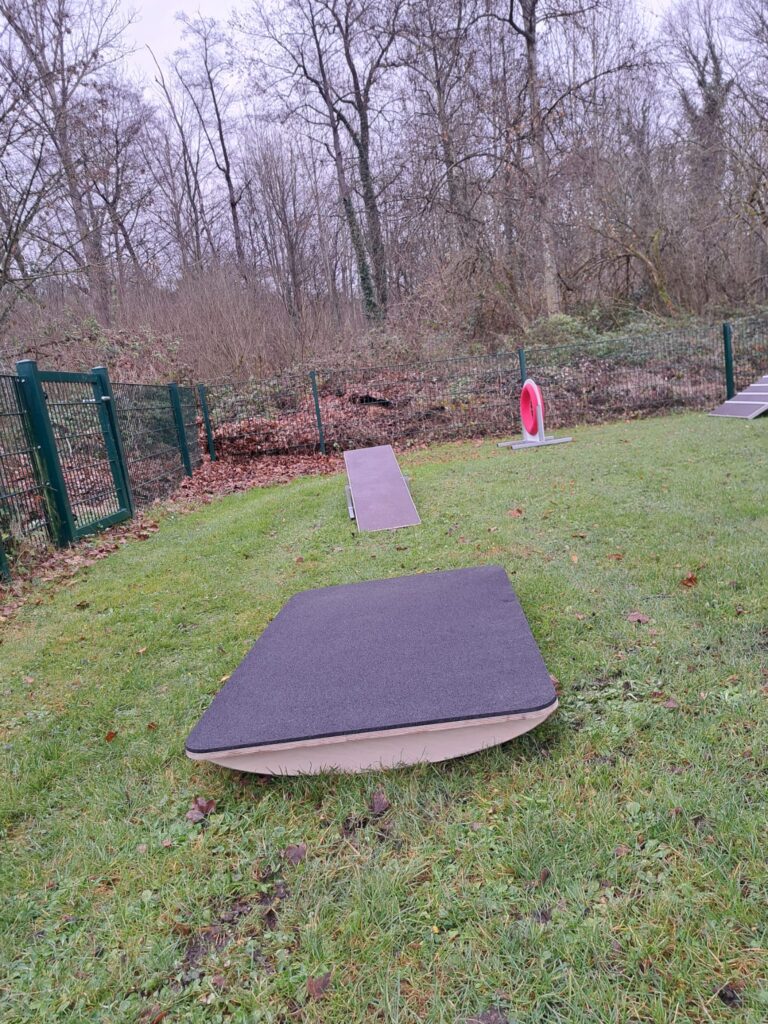 Auf dem linken Bild sehen wir ein sehr variables Teil, mit dem leicht das Gehen auf verschiedenen Untergründen simuliert werden kann (s. rechtes Bild). Auf dem Teil links im Hintergrund muss der Welpe lernen, auf wackeligem Untergrund zu laufen.