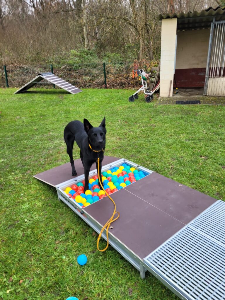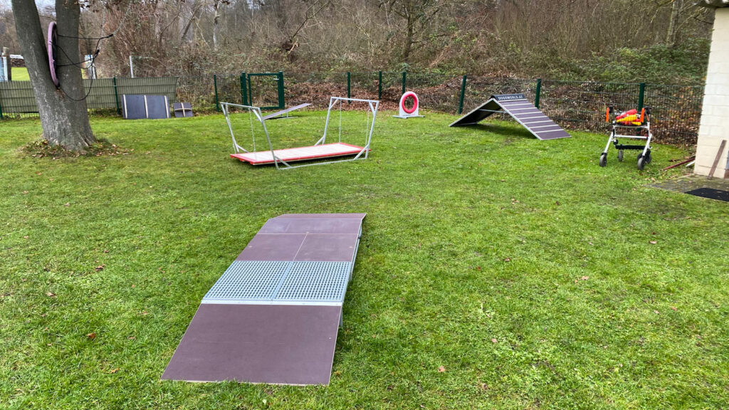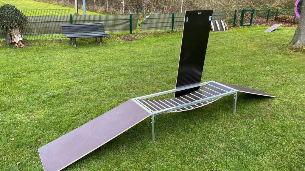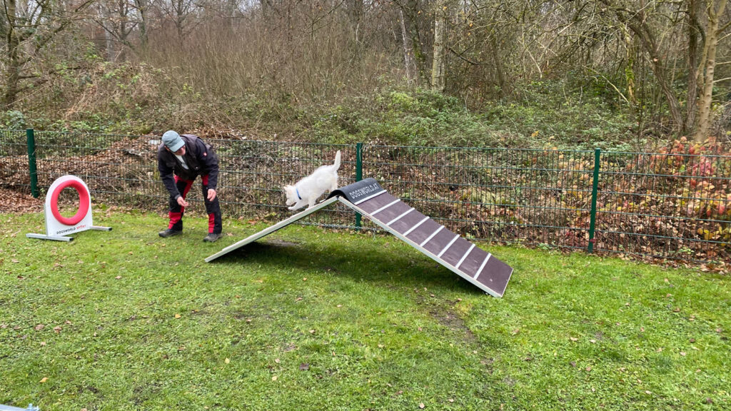 Wackelig wird es auch auf diesem Brett, einem Klassiker des Welpentrainings, ebenso die Welpenwippe im Hintergrund. Während der Kleine hochläuft, kippt die Wippe. Eine Herausforderung, denn er muss lernen, jetzt nicht panisch abzuspringen, sondern weiter runterzulaufen. Eine gute Voraussetzung für einen eventuellen späteren Einstieg ins Agility-Training.